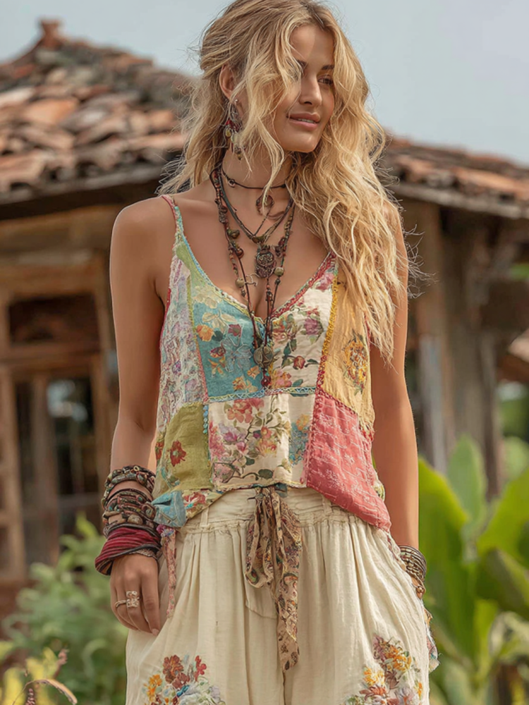 Women's Retro Classy Boho Patchwork Floral Embroidered Art Linen Art Linen And Cotton Camisole