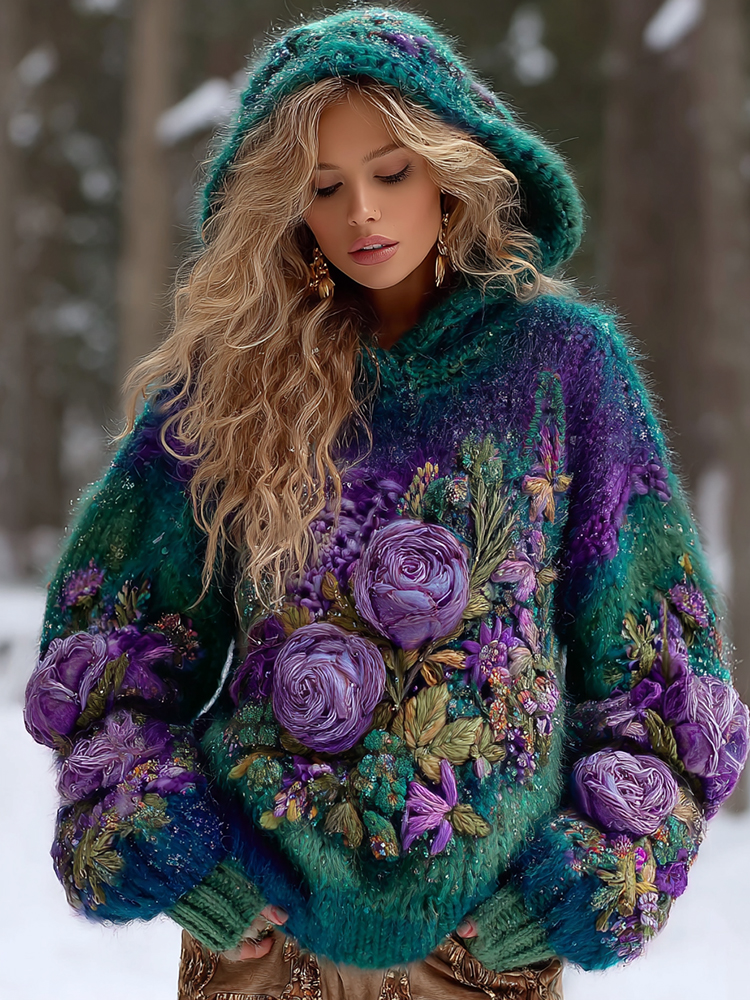 Women's Gradient Rose And Floral Flannel Knitted Warm Hooded Sweater