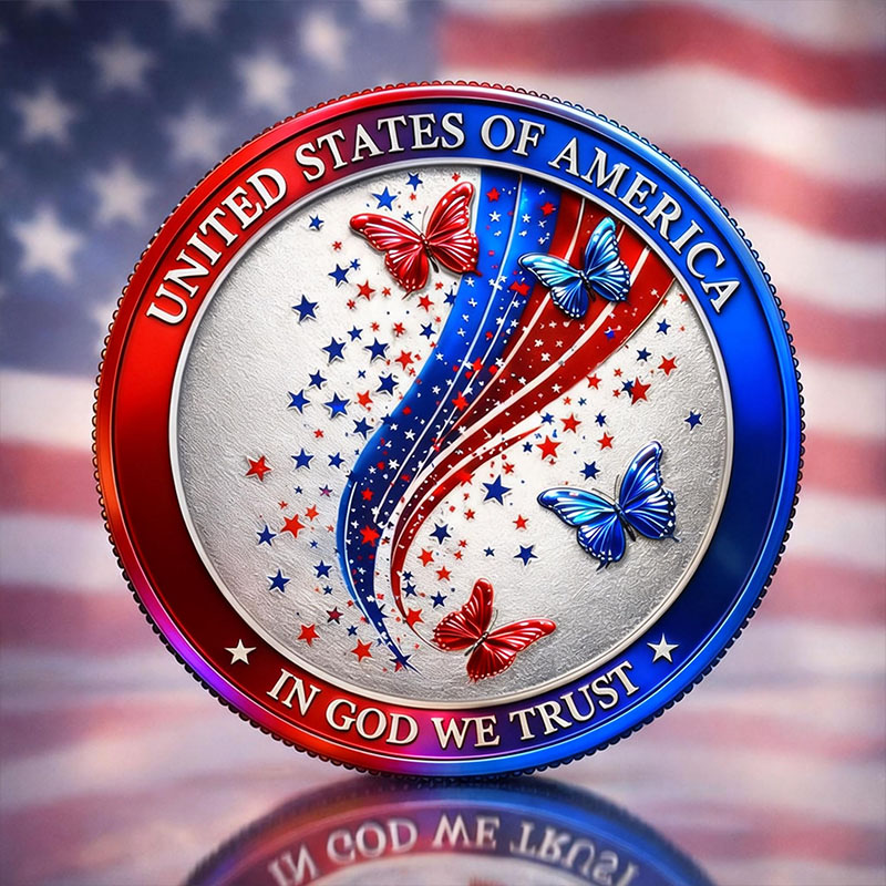 The reverse showcases flowing red, white, and blue ribbons that symbolize the journey of freedom and the continuity of the American spirit. Colorful butterflies flutter across the surface, representing hope, renewal, peace, and cultural diversity—an expression of the nation’s inclusiveness and vitality.