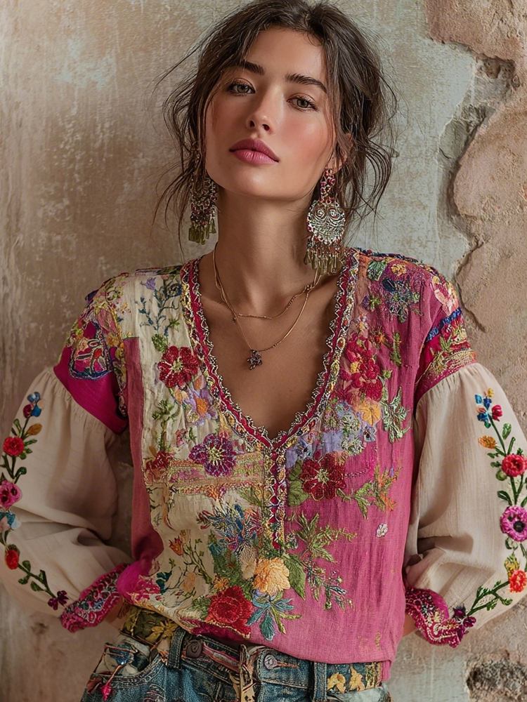 Women's Bohemian Floral Embroidery Art V-neck Contrast Color Long Sleeve Linen Blend T-shirt