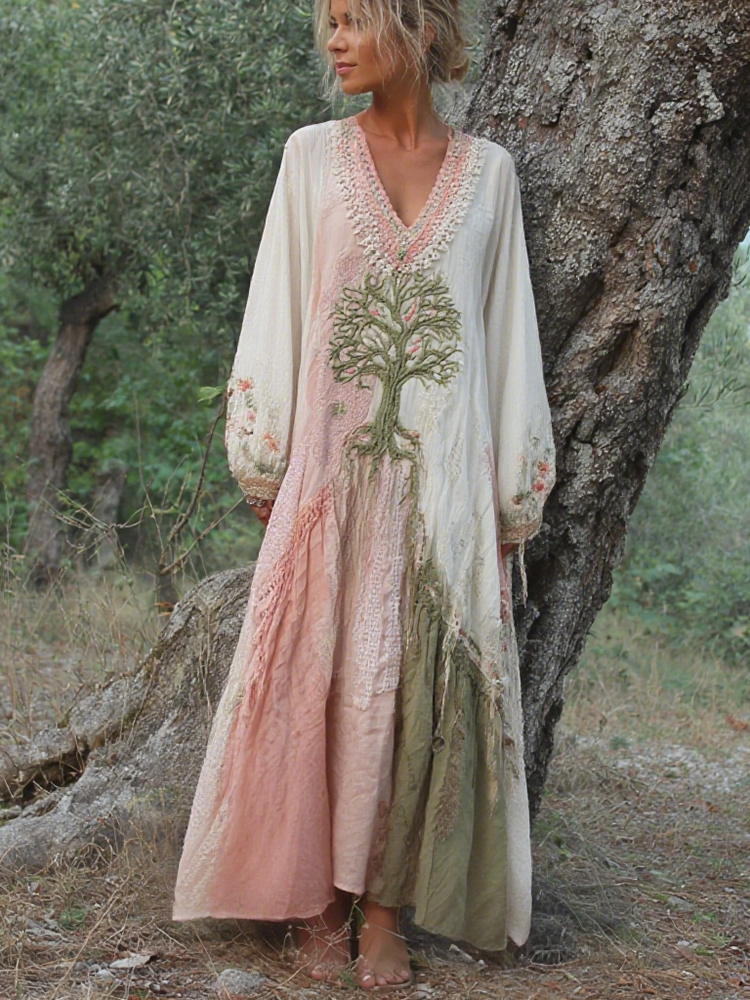 Women's Vintage Tree Of Life Patchwork Linen Long Sleeve Dress
