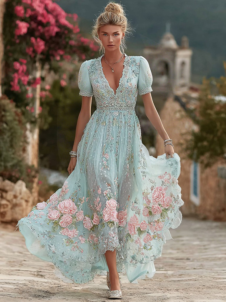 Women's Vintage Bohemian Floral Embroidery Casual Short Sleeve Dress