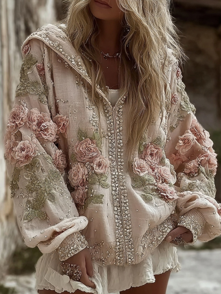 Women's Vintage Rose Embroidery Art Casual Zip-up Hoodie