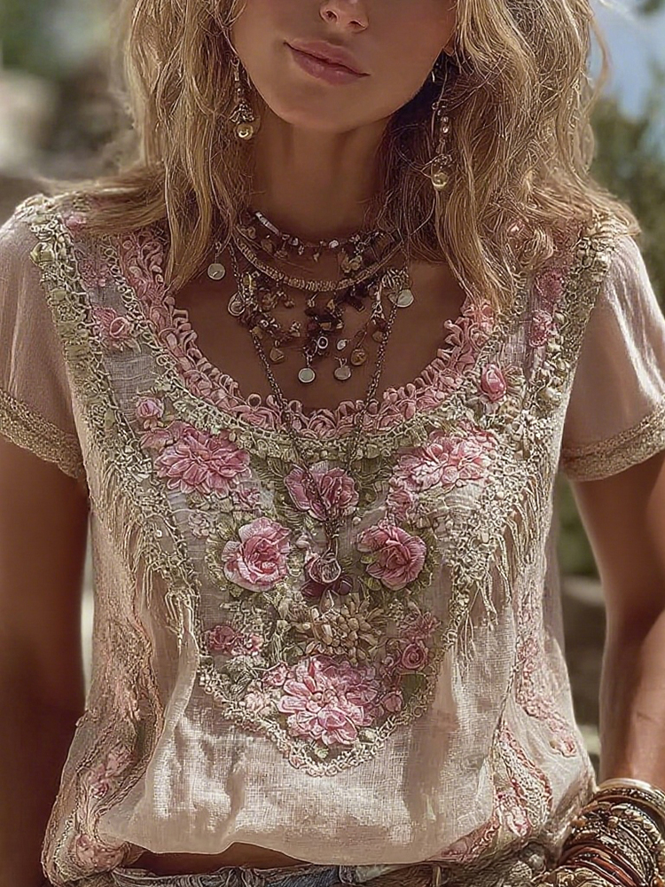 Women's Vintage Floral Pattern Crew Neck T-shirt