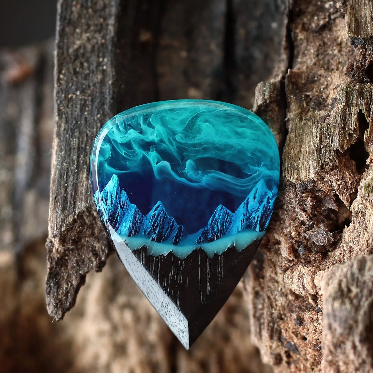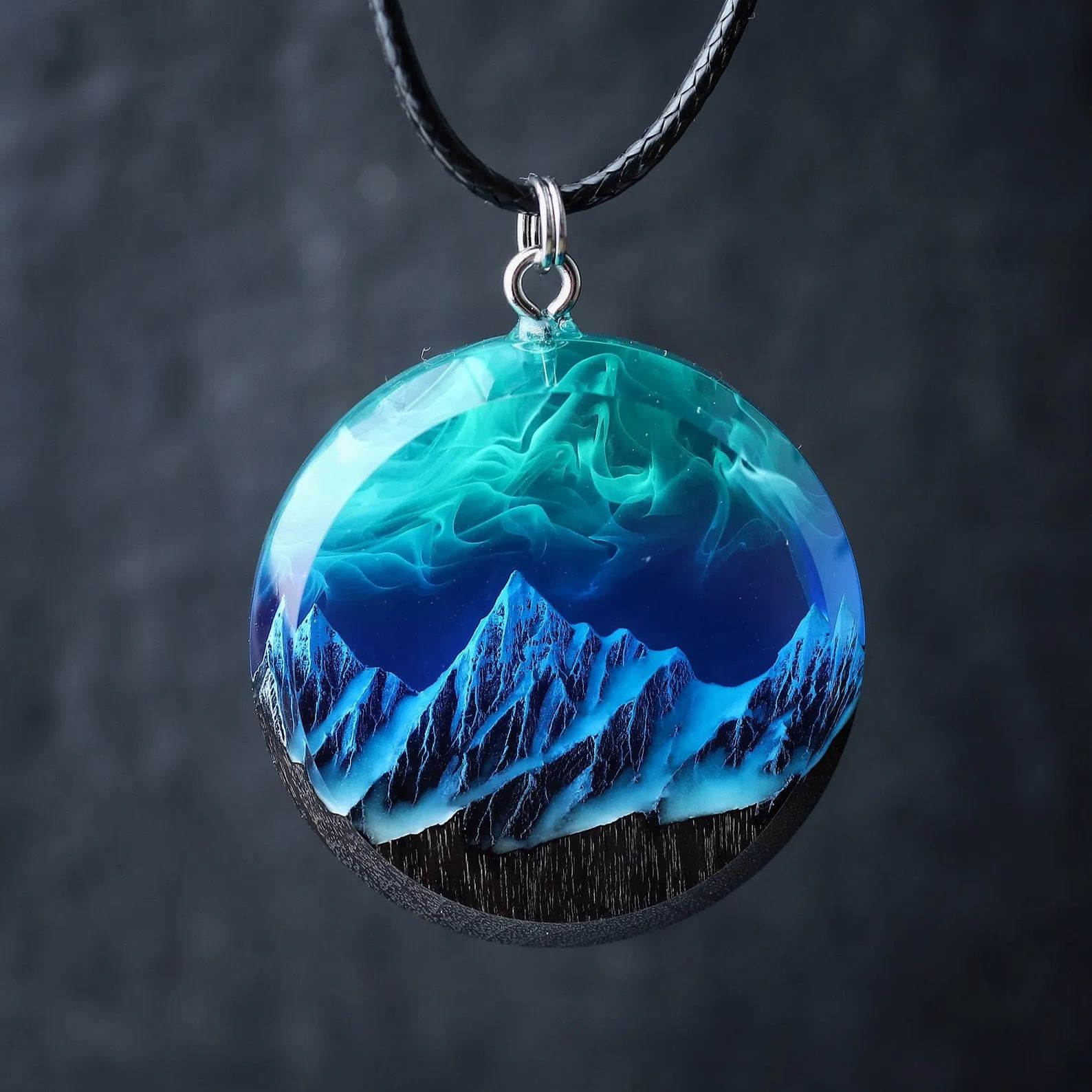 Handmade round pendant from black hornbeam wood and resin with mountain inside.