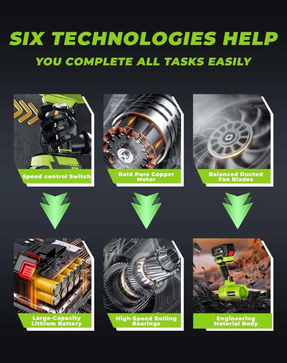 Classic blowers disperse air and are heavy due to obsolete motors. The Blower Cordless uses a high-speed "Brushless" motor that compresses air.