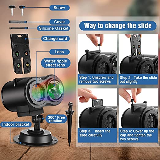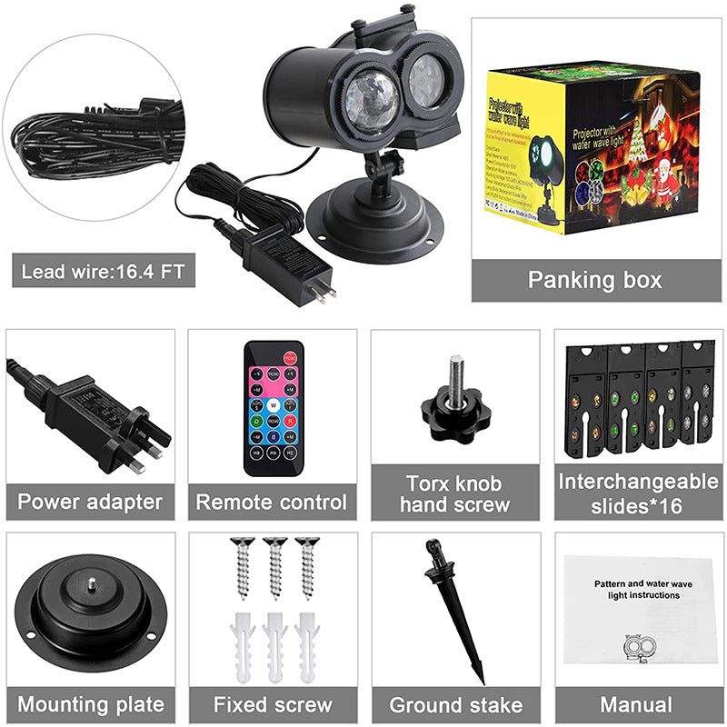 Equipped with two projection heads, one for 16 slide patterns suitable for most holiday and party entertainment in whole year, and another for 10 colors ocean-wave ripple effect. You can freely customize the lighting effects produced by single ripple water wave, image mode motion or both. Effective remote range up to 50 FT