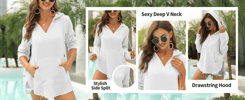 Slip into effortless comfort on sunny days with this lightweight hooded cover-up. Crafted from a breathable knit blend, it offers airy coverage without weighing you down. The relaxed V-neck and softly draped hem create a flattering silhouette, while the roomy front pocket and adjustable hood add practical flair. Perfect for beach strolls, poolside lounging, or casual outings, it’s your go-to layer when you crave style and ease in one.